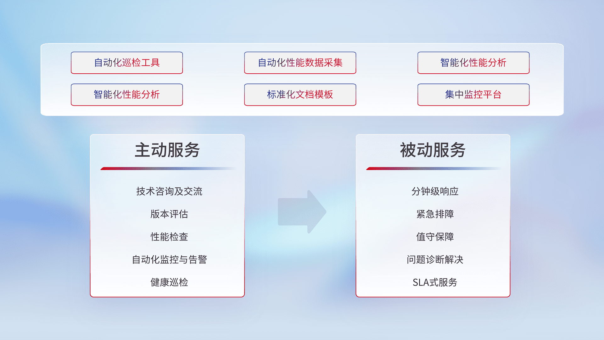 智能化工具和标准化文档,,,保障服务质量,,,提供主动服务(包含技术咨询、、、版本评估、、、性能检查、、、自动化监控与告警、、健康巡检)和被动服务包含(分钟级响应、、紧急排障、、、、值守保障、、、问题诊断解决、、、SLA服务)。。。